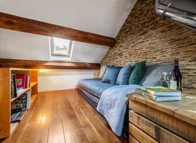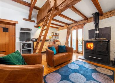 There is a cosy double bedroom, with a skylight for star gazing, an open plan living area with kitchen, lounge and dining area and a spacious shower room.