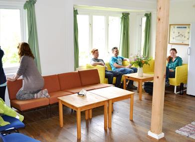 Approaching the Eco Cabin from the covered link area you enter a welcoming, open-plan living space with kitchen facilities to meet the needs of self-catering groups. Beyond is the bedroom area with six bedrooms, including two singles, plus shower/wet rooms and toilets.
