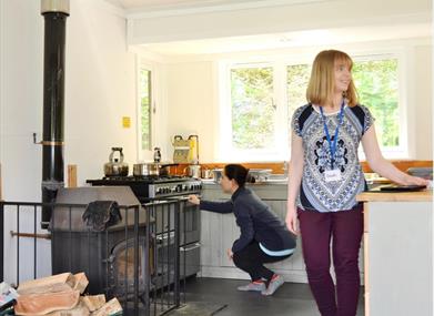 Hot water for the cabins is generated by solar thermal panels on the grass roof as well as via the wood-stove for heat and hot water. A range cooker with hob and two ovens can be used for cooking.