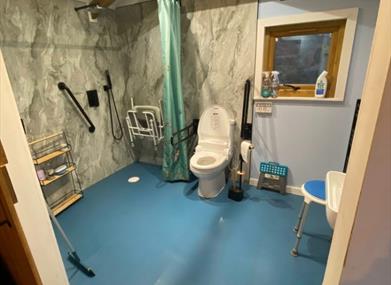 The spacious wet-room has a step-free shower, rainfall shower head, separate low-level hand-held shower, fixed grab-rails for shower, wall-mounted shower seat with drop-down arms and legs for stability, a bio-bidet wash-and-dry WC (transferable from both sides), drop-down grab-rails either side of WC, lever-style taps, and wheel-under washbasin with fixed grab-rails. A self-propelled wheeled shower/commode chair and static shower chair with arms are available to guests.