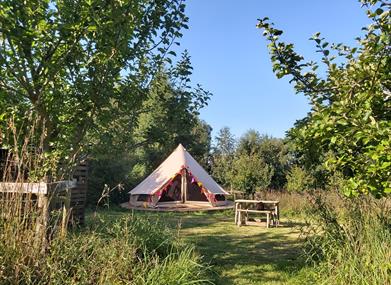 Our two beautiful 5m Bell Tents are each set in their own private spaces, one in a meadow surrounded by wild flowering grasses, the other in an apple orchard with wild flowers and it's own dog friendly enclosure so your furry friends are free to explore!