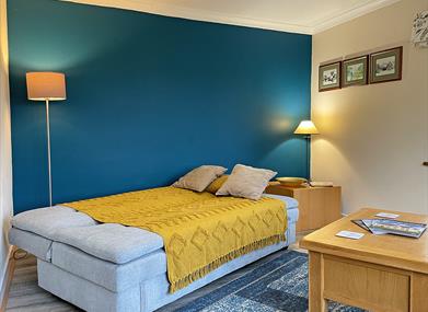 Offers you privacy of your own front door via the external stone staircase and the ease of a home from home vibe. Inside you’ll find a comfortable double aspect Lounge overlooking our fields, Kitchen/Diner for preparing meals, Bathroom with shower over decent width bath and a cosy Bedroom with King size bed and plenty of wardrobe space for longer stays.