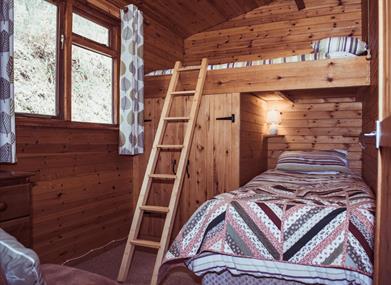 Take B4568 out of Newtown, signposted to Bettws and Tregynon. Approx 1 mile turn right past Llanllwchaiarn Church. Follow road to left for 500 metres, turn left up track into woodland through gate. Cabins are first turn to left.