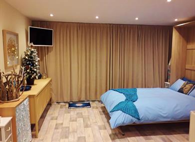 Sea Moss Cabin was newly renovated in 2020. It is situated on the Woodlands Holiday Park in Southern Snowdonia, with it's own fully accessible parking space. Open the French Doors on to the private patio with it's surrounding gardens, set in woodland. The view looks down towards the sea in the distance.