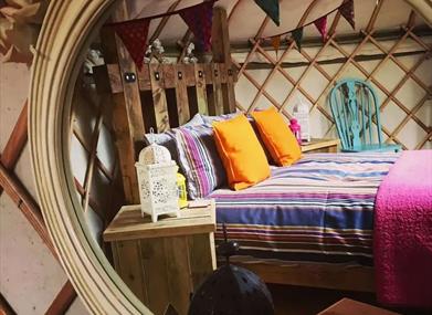 A luxury glamping experience. Snuggle down in a kingsize bed and wake to stunning views of the Mid Wales countryside.