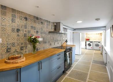 The inviting living room features a log burner, perfect for cosy evenings, alongside a Smart TV for entertainment. Adjacent to the well-equipped kitchen is a large dining room with a stunning oak table and another charming log burner, creating a warm and sociable space for shared meals. The kitchen is a dream for culinary enthusiasts, boasting a large fridge/freezer, dishwasher, and a utility area with a washer and dryer. A separate porch provides a practical space for hanging coats and wet boots after a day of exploring.