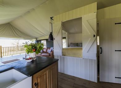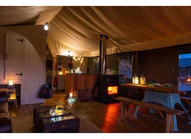 Inside the tents you will find hotel quality beds and linen, a fully equipped kitchen area with bespoke slate and oak kitchen units. A comfy living area with leather sofa, coffee table, dining area and woodburning stove/cooker.