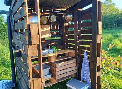 - An outside camp kitchen with camping stove, gas, pans, plates, cups, cutlery, utensils, chopping board etc