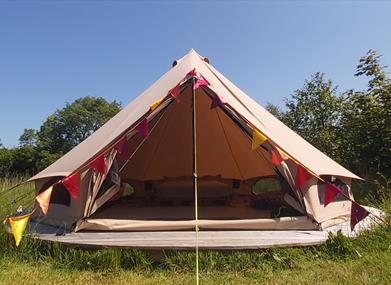 Our two beautiful 5m Bell Tents are each set in their own private spaces, one in a meadow surrounded by wild flowering grasses, the other in an apple orchard with wild flowers and it's own dog friendly enclosure so your furry friends are free to explore!