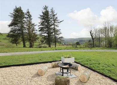 - Front, gravelled garden area with wood-fired hot tub, fire pit, and picnic bench