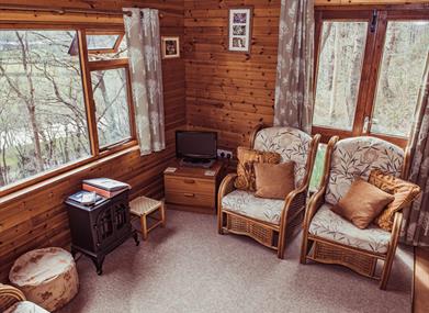 Two log cabins situated in 9 acre South facing woodland overlooking the River Severn, 1.5 miles from Newtown, Powys. Private fishing on River Severn included. The cabins are well furnished for comfort and convenience. Each cosy cabin has a colour television, DVD player, electric heating, electric cooker, microwave oven, refrigerator, and the kitchen has all necessary utensils. Each cabin has two bedrooms sleeping 4 people. Electric shower in the bathroom, and electric towel rail.