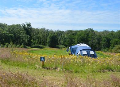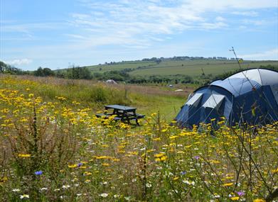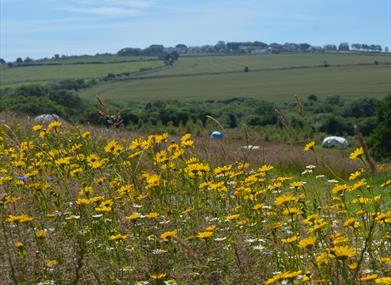 Every pitch harbours uniquely charming characteristics. The higher camping pitches such as Gannet’s Ledge and Fulmar’s Nest have the most spectacular views down the valley to the coastline; they have a wonderful sense of open space and are a little closer to the bathrooms and the eco lodge restaurant and bar. The lower pitches such as Mermaid’s Purse and Kelp Beds benefit from the shelter of the woodland that swathes the lower part of the valley; each is a cosy suntrap immersed in birdsong. Grey Seal is at the opening of the woodland clearing at the foot of the valley, perfect for watching woodpeckers and ravens in the valley. Blenny’s Nook is in the far corner of the campsite, a cosy quiet nook fringing the outer woodland; this is a perfect little suntrap with hardly a whisper of wind! Take a look Our pitches are all surrounded by saplings and bordered with wildflowers, which gives them a sense of personal space and privacy. The geodesic dome is situated in a hidden woodland clearing and the foot of the camping field, in the pitch called Harbour Porpoise.