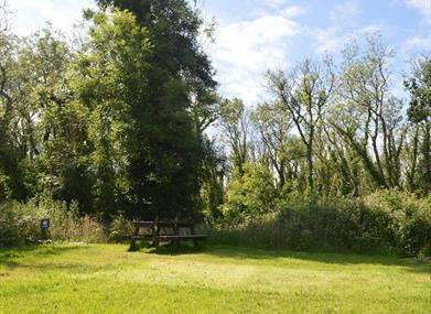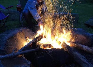 Private pitch with its own fire pit and picnic table, ample space for one large family tent and one pup tent.