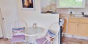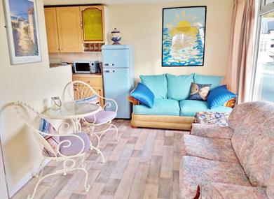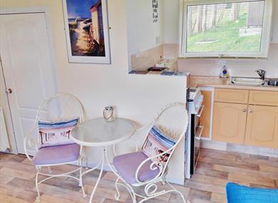 This beautiful South West aspect offers great views of sunsets over the sea. Set up the dining table, large parasol and sun loungers (which are provided in the cabin) and relax in the scenic outdoor setting. You will be surrounded by Scots Pine trees and Buddleia bushes that will attract butterflies in summer. The interior is open plan (except the ensuite shower and toilet.) and has a seaside theme.