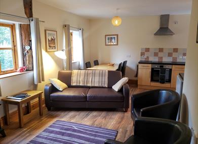 A converted 1700's oak framed barn with Spa hot tub. Modern open plan style on the inside,traditionally timber-clad on the outside. Enclosed outdoor area with Spa hot tub which is fun to share or soak away cares and a garden table for " al fresco" dining. All under big skies, between a mighty ridge and the rolling valley.