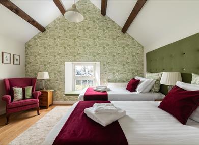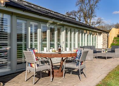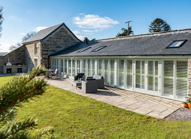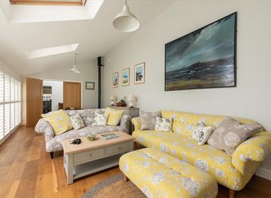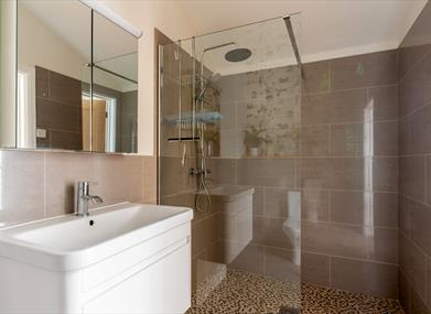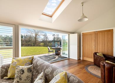 The spacious orangery-style lounge features floor-to-ceiling bi-fold doors, creating an ‘outdoor room’ feel, while the cosy snug with a wood burner is perfect for relaxing after exploring the Preseli Hills and heritage coast. The Woodland Suite boasts a super king bed, garden access, and an ensuite with a walk-in rain shower, while the Garden Cwtch offers flexible super king/twin beds and garden views. A luxury family bathroom, fully equipped kitchen with a large dining area, and a handy utility room (or ‘doggy ensuite’) ensure a comfortable stay.