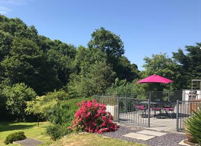 - Bi-fold doors open onto hardwood decking and an enclosed terrace with BBQ.