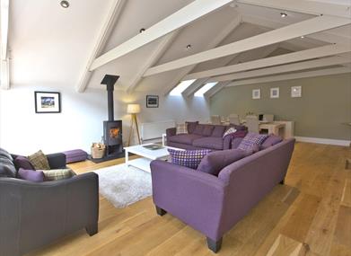 - Large, contemporary living room with beamed apex ceiling, woodburner, and three comfy sofas.