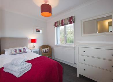 - Second bedroom: Single bed, blackout blind, large chest of drawers and wardrobe.