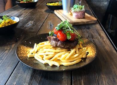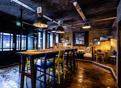 The Bistro offers a stylish industrial chic setting, with plush crushed velvet seating complimented by reclaimed wood and brick from the original public house that it was.