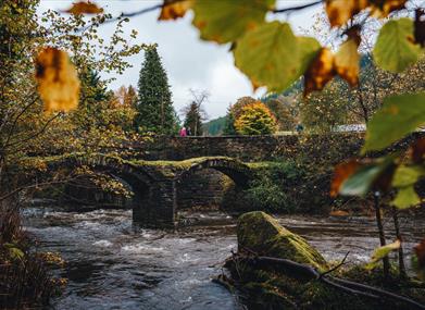 This early road bridge over the River Dyfi was built by Dr John Davies of Mallwyd (1604-1634). He was rector in the area and a famous Welsh scholar of the Welsh language and culture, and translator of the Bible, who undertook many works of improvements in the first decades of the 17th century. Today the bridge is a Scheduled Ancient Monument. It is very close to the modern road bridge on the A470 at the entrance to Meirion Mill