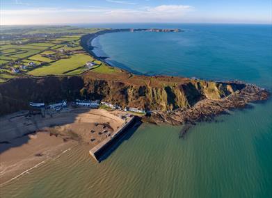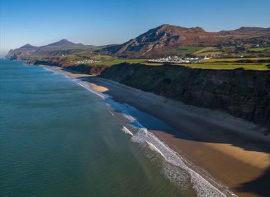 The beach leads to picturesque Porthdinllaen, originally a fishing port based around a natural harbour at the west end of a bay. There are only about two dozen buildings at Porthdinllaen, with the Ty Coch pub the centre of the village and visitors must walk across the beach from Morfa Nefyn or across the golf course on top of the headland, past the Iron Age hillfort.