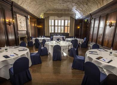The main function room, the Hercules Hall, is a unique Jacobean oak-panelled hall with a plaster barrel-vaulted ceiling depicting the labours of Hercules. It can host from 30 to 120 guests.