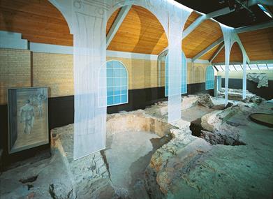 Inside a modern covered building in today’s Caerleon you can still explore the remains of the immense natatio, or open-air swimming pool, that once held more than 80,000 gallons of water. Thanks to the wonders of film projection you’ll glimpse a Roman soldier still diving the depths today.