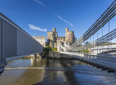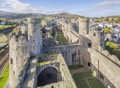 In the distance rise the craggy mountains of Snowdonia and spread out below you are the harbour and narrow streets of Conwy – still protected by an unbroken 1,400-yard (1.3km) ring of town walls.