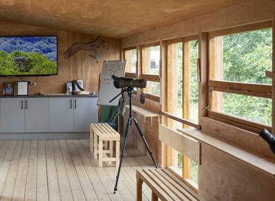 Watch fish deliveries to the nest, chicks feeding and fledging on screen and see these iconic birds soaring high above you.