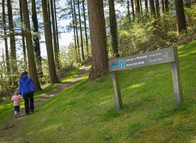 There are glimpses of the waterfall through the trees on the Waterfall Walk through the lower part of the valley. This moderate-graded circular trail crosses over a wooden bridge and follows the stream back to the car park. The walking trails are waymarked from start to finish.