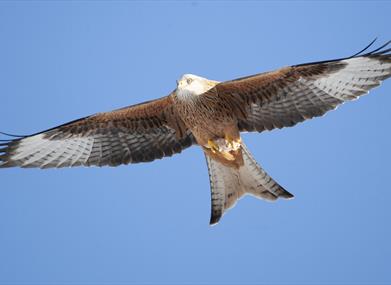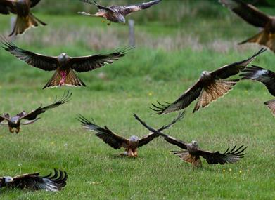 Located half a mile from Rhayader town centre, in the beautiful countryside of Mid-Wales, overlooking both the Wye and Elan valleys. The Red Kites are fed once daily at 2pm (end October to end March) and 3pm (end March to end October). The number of Kites being fed varies dependent upon the time of year from around 300 in the summer to 500 in the colder months. Rare leucistic (white) Red Kites frequently visit the farm.