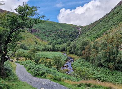 The falls are known locally as Pistyll Rhyd-y-meincau and walk from the car park to the falls is relatively easy over slightly undulating ground alongside a stream and through some trees. The path is very accessible with gravelled paths that make it very easy to get with the cascading waterfalls opening up in front of you.