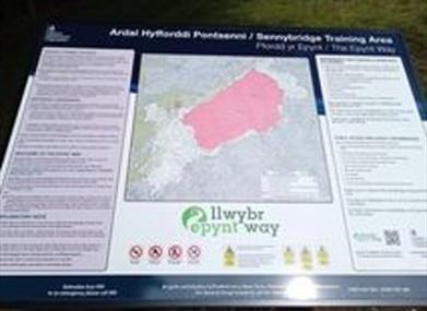 THE EPYNT WAY is a 65 km long distance path around the circumference of the Sennybridge Training Area. It is open to walkers, equestrians and mountain bikers. The trail is well marked with frequent, yellow-topped marker posts which have green and white discs. Finger posts and link posts denote entry and exit paths. The path is normally open at all times. Users should check for any closures on the website.